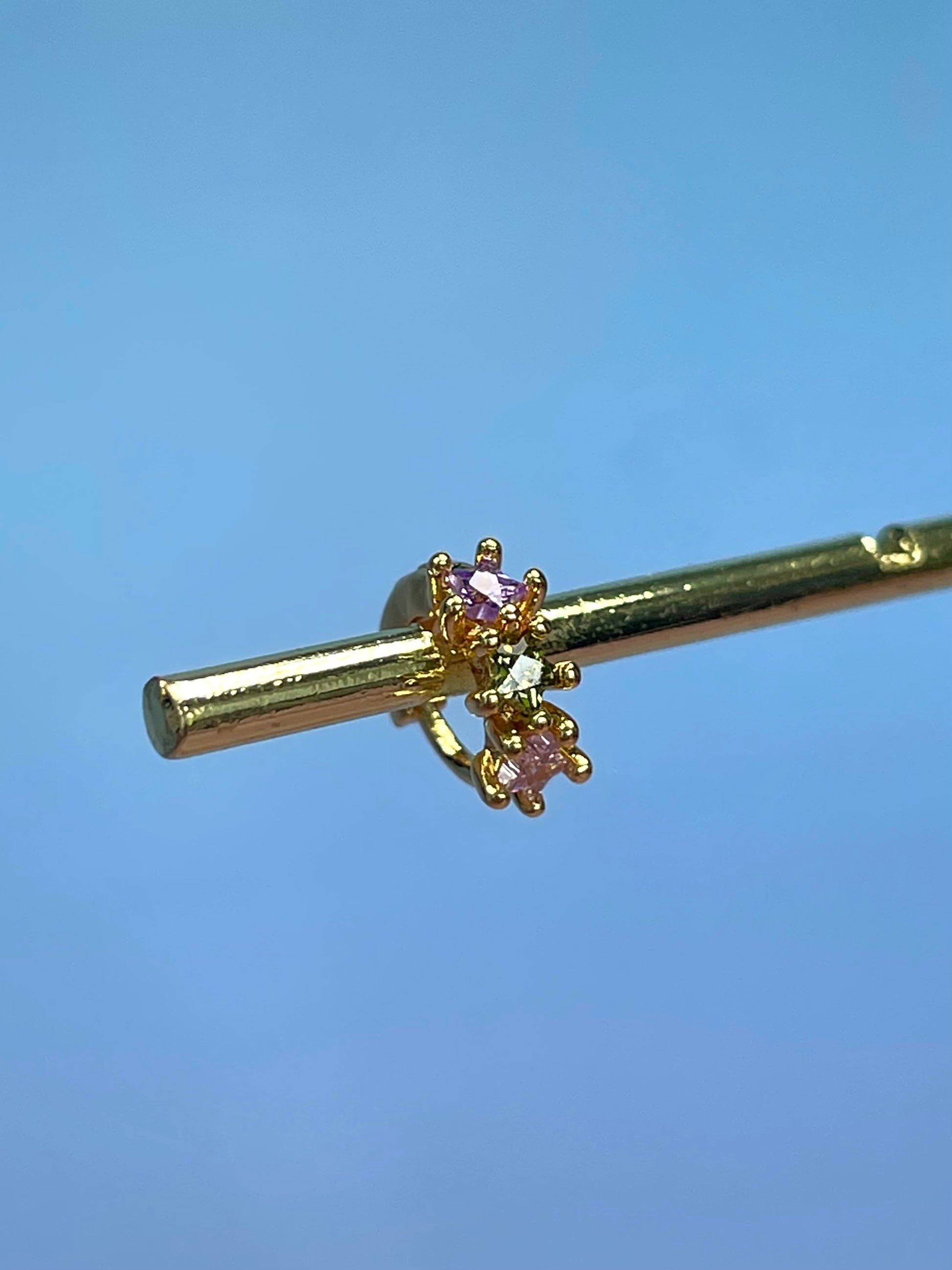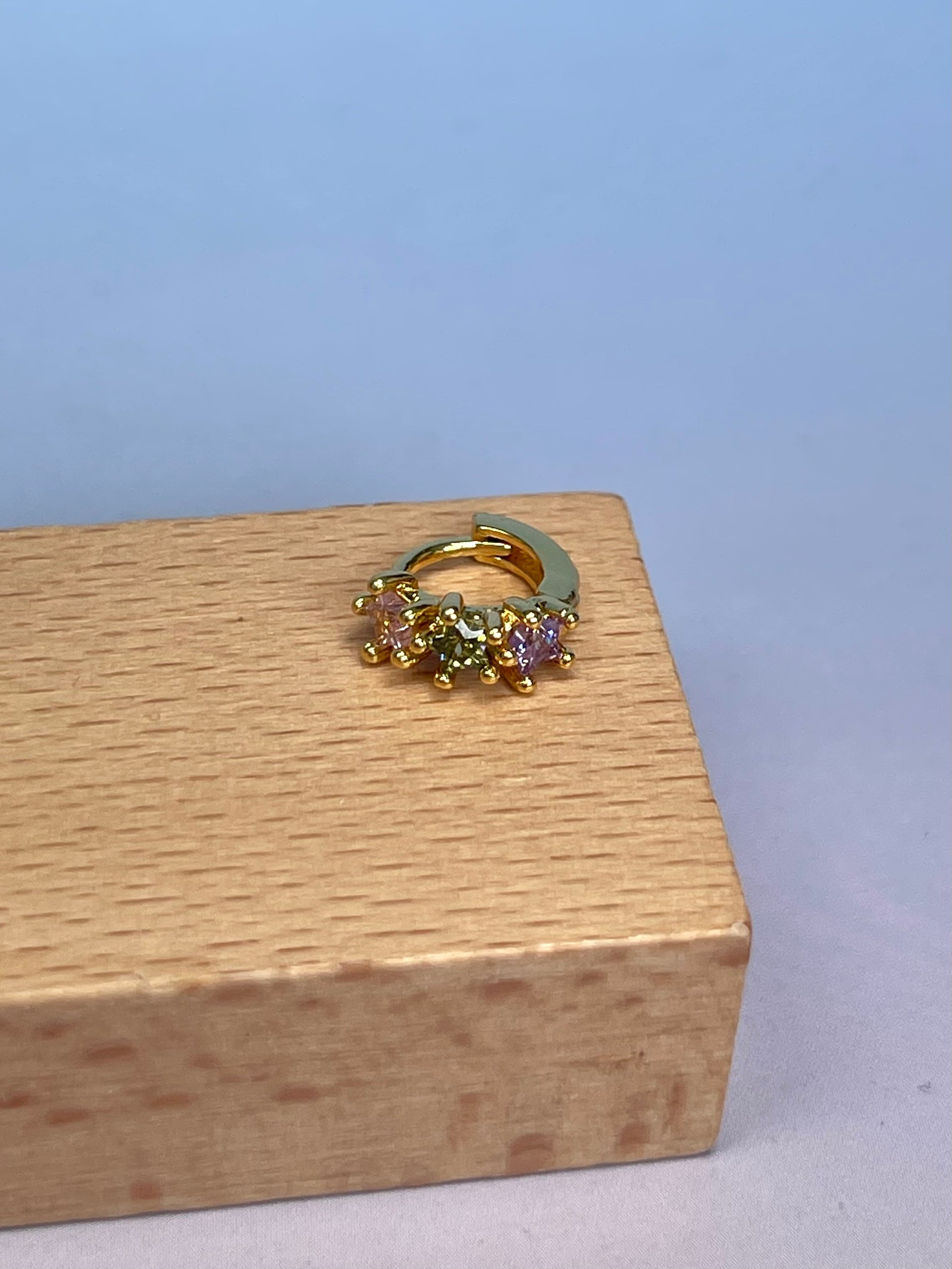 Este aro con brillantes pequeños verde, lila y rosa claro en forma de estrella, es perfecto para añadir un toque de delicadeza y elegancia a cualquier look. Su brillo y luminosidad lo hacen fácilmente combinable con otros pendientes. ¡No te pierdas esta joya imprescindible!