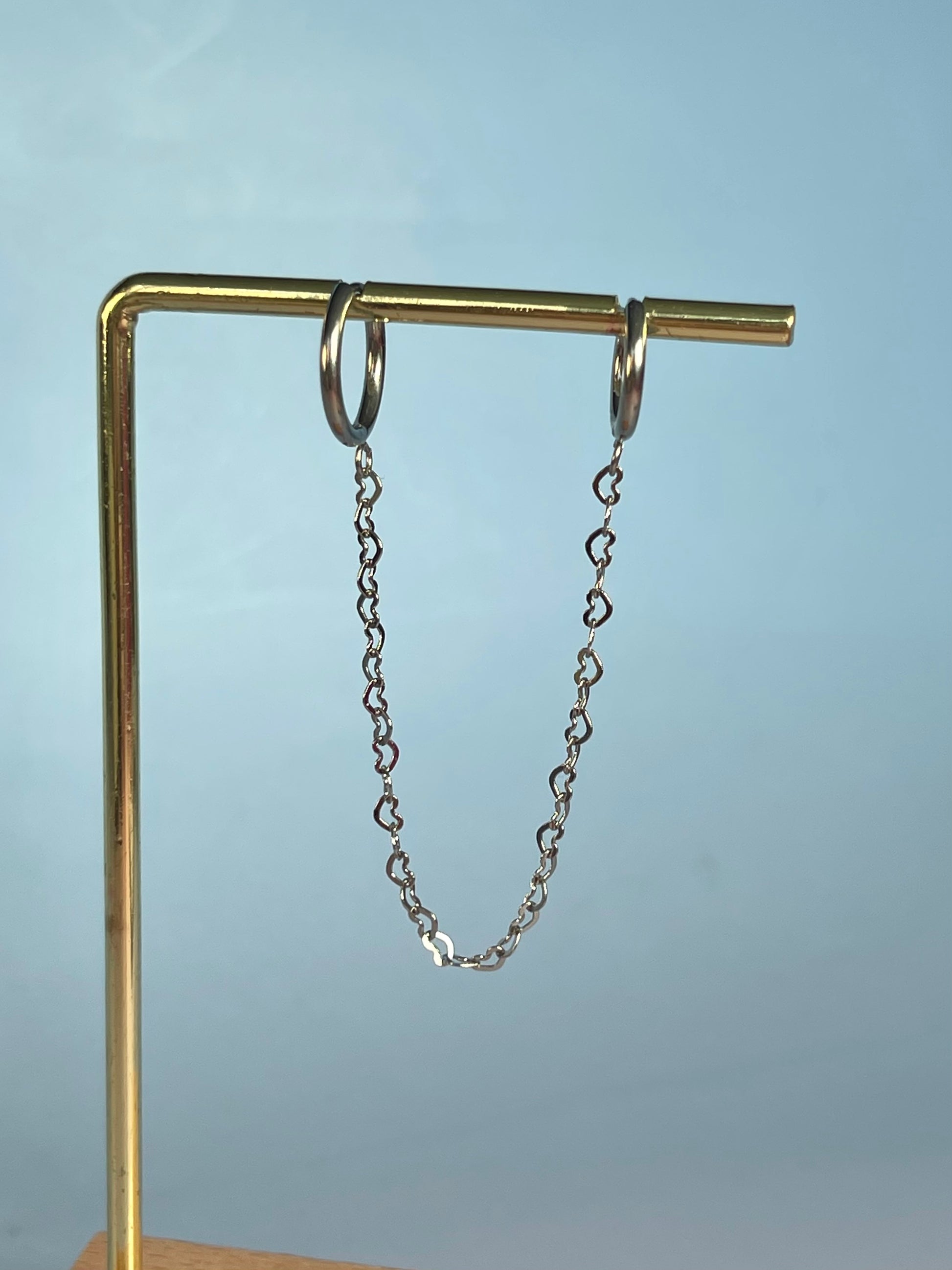 - Tipo de joya: aros pequeños conectados por una cadena fina.